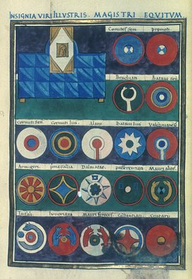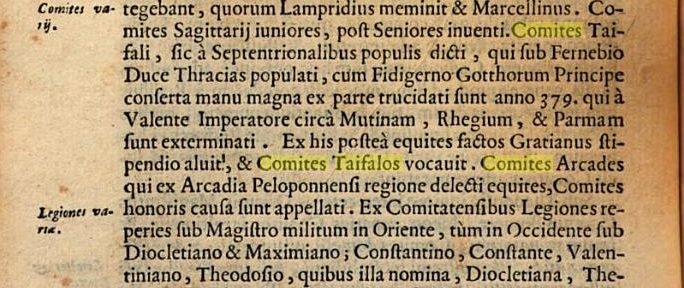 The Taifals were a European people group which had relatively close associations with various Germanic and Sarmatian groups. In the late fourth century a significant number of Taifali were settled within the Roman Empire, particularly in Western Gaul and also in the Eastern Byzantine Empire in Phrygia. They subsequently supplied mounted units to the Roman army and continued to be a significant source of cavalry for early Merovingian armies. According to the Notitia Dignitatum of the early fifth century, there was a unit called the Equites Taifali established by Emperor Honorius under the Comes Britanniarum in Britannia. This unit may have been the same unit as the Equites Honoriani seniores mentioned around the same time. Thus, the Equites Honoriani Taifali seniores served in Britain while the Equites Honoriani Taifali iuniores served in Gaul under the magister Equitum. The Taifali iuniores used the dragon and pearl device on their shields. The Equites Taifali seniores had mirrored bears holding the shield boss, as illustrated in the Notitia Dignitatum. The Notitia also lists a unit called the Comites Taifalos in the Eastern Byzantine Empire, which was most probably formed in the reign of Theodosius I. The Comites Taifalos were recorded as being part of the Magister Militum Praesentalis I which was one of the two main field armies normally stationed in Greece in support of Danube frontier.
